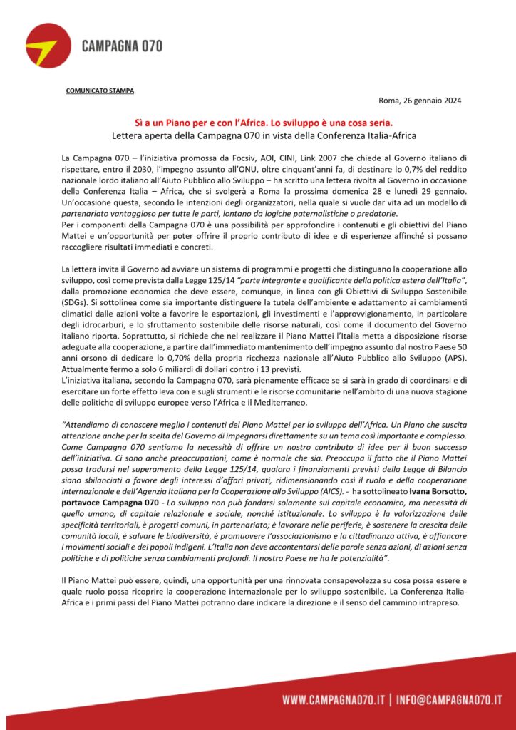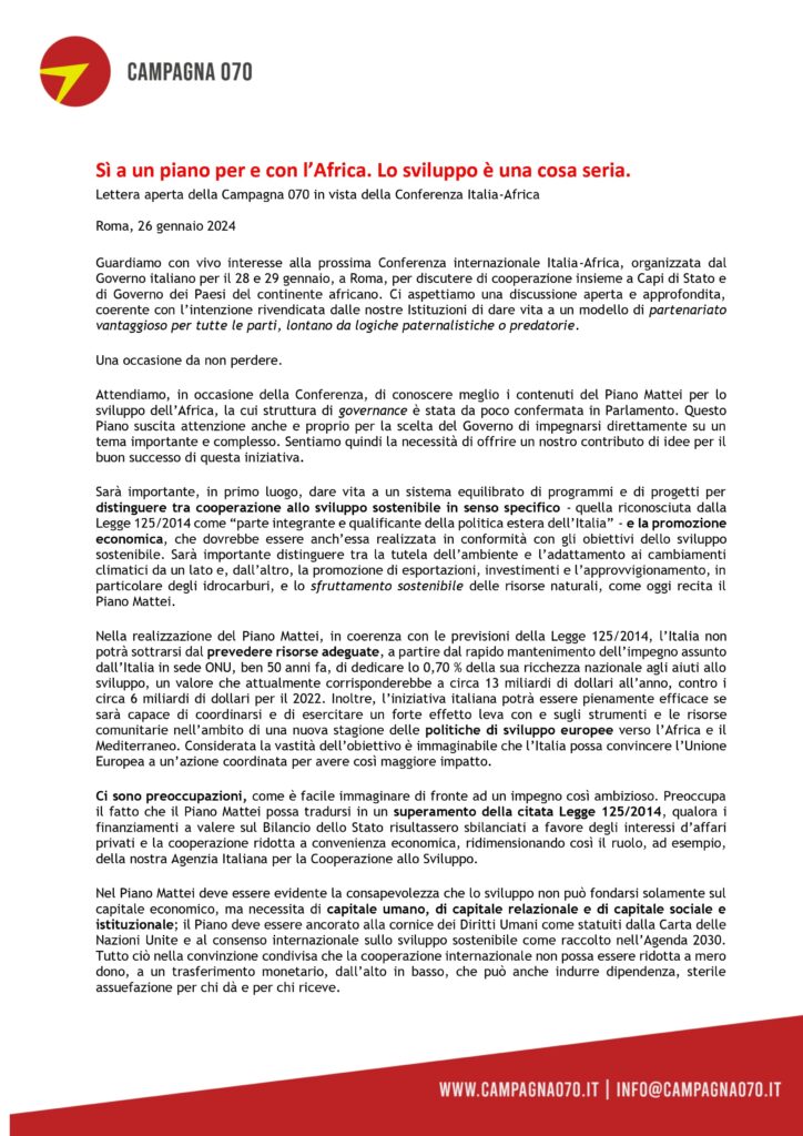 Di seguito la “Lettera aperta alle istituzioni” e il “Comunicato Stampa” della Campagna 070, tra i cui promotori vi è Focsiv, in merito alla Conferenza Italia-Africa che si terrà a Roma domenica 28 e lunedì 29 gennaio.
