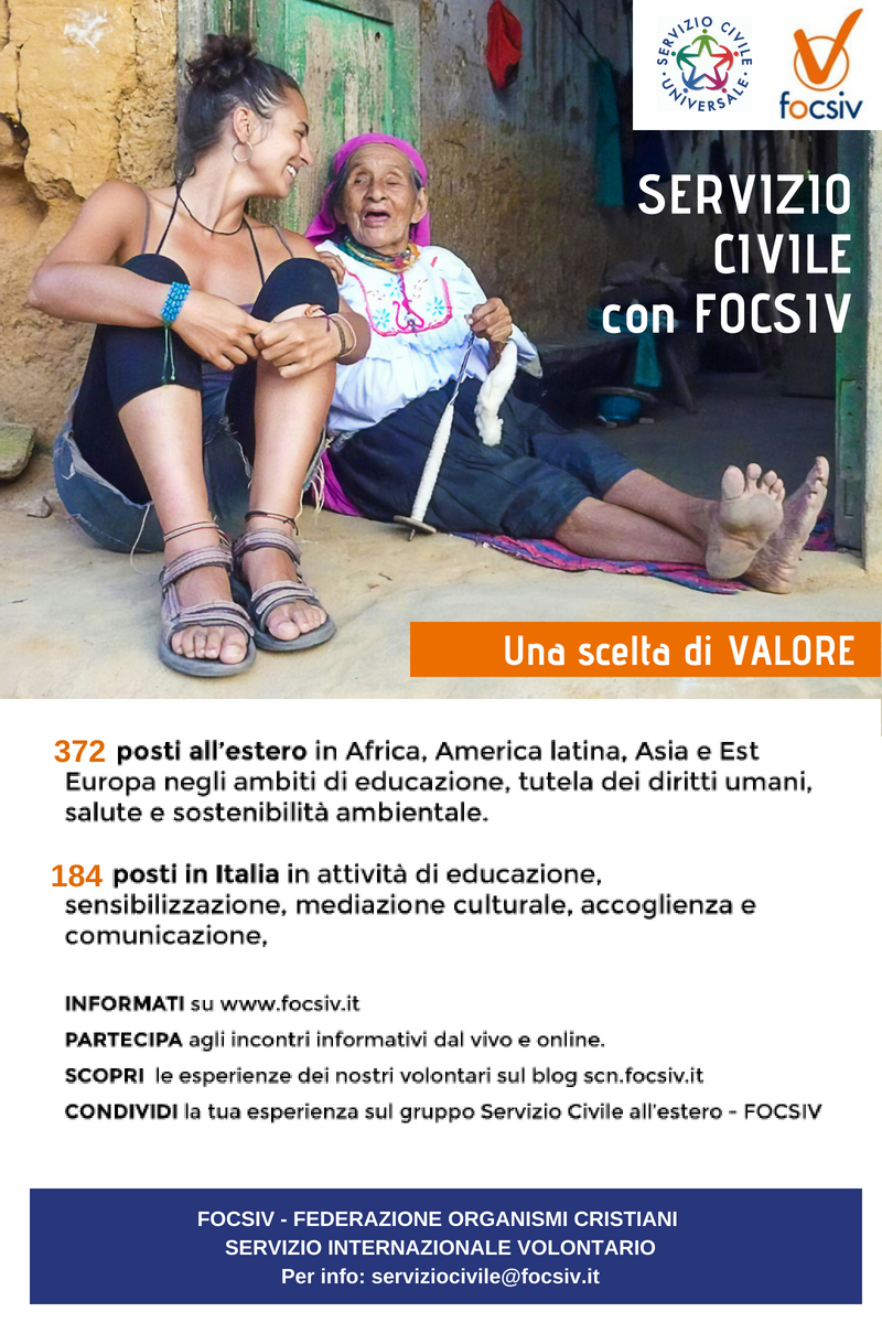 Per informazioni e per candidarsi: https://www.focsiv.it/servizio-civile-volontario/